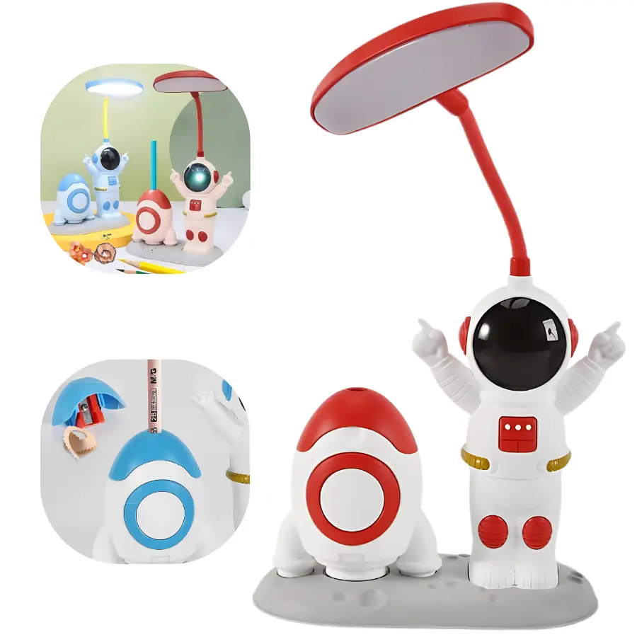 Además de ser un velador, cuenta con un sacapuntas y un espacio en la navecita acompañante para colocar lápices o lapiceras.